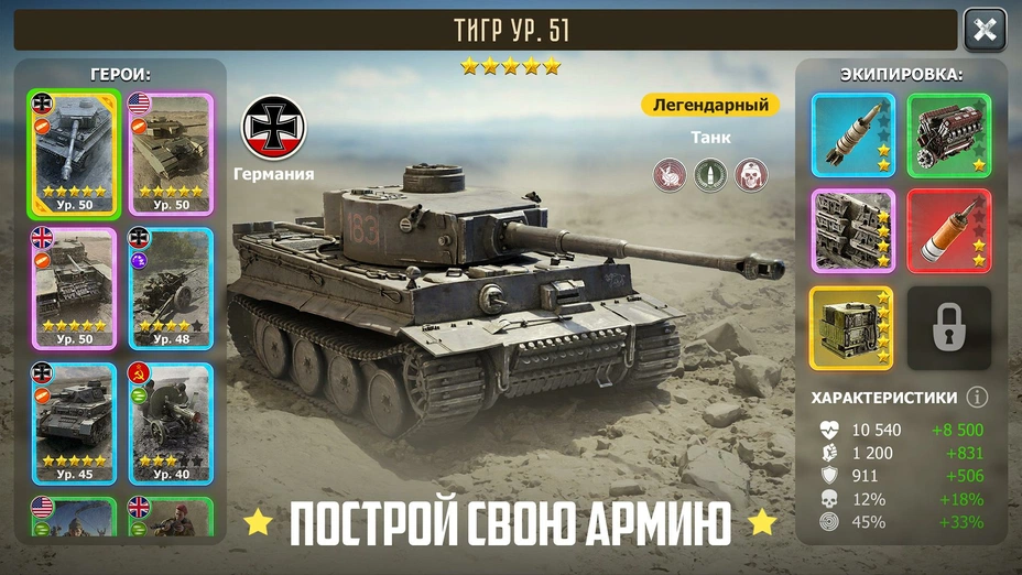 - 🔩 Модернизация оборудования — ставьте на танки более мощные орудия, усиленную броню, новые двигатели. Самолёты можно оснащать улучшенным вооружением и прицелами.